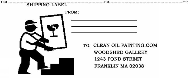 Place the painting into a plastic bag. Cut two pieces of cardboard the same size as the painting. Tape the cardboard securely to cover the front and back of the artwork. Fill out the Service Request form and tape it to the wrapped painting. Place the protected painting into a box which is 3" larger than the painting in all directions and surround it with packing material (bubble wrap or wadded paper works fine, as long as there is padding on all sides.) Note: Mirror Boxes available from many pack & ship stores (UPS, Fedex, etc. work well for paintings. Consult the stores for the proper size for your artwork.
